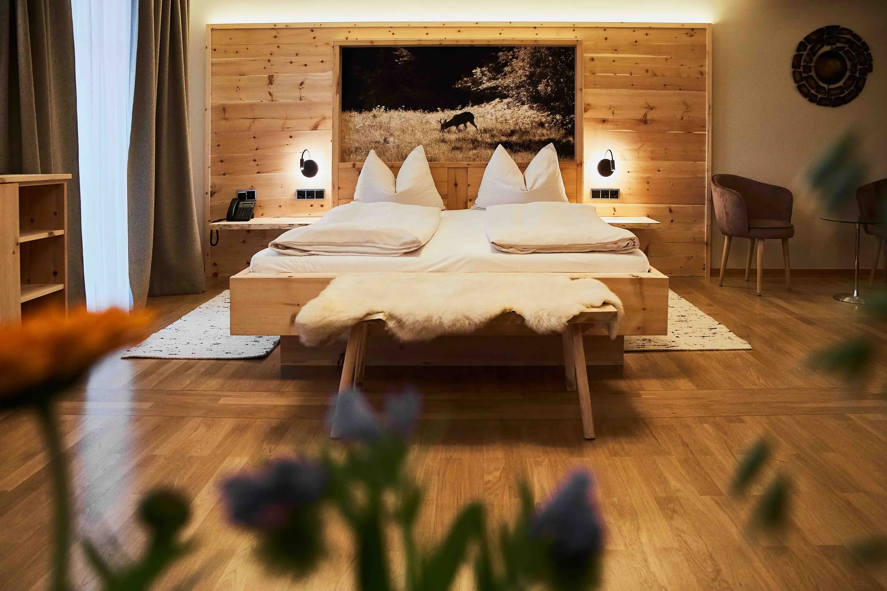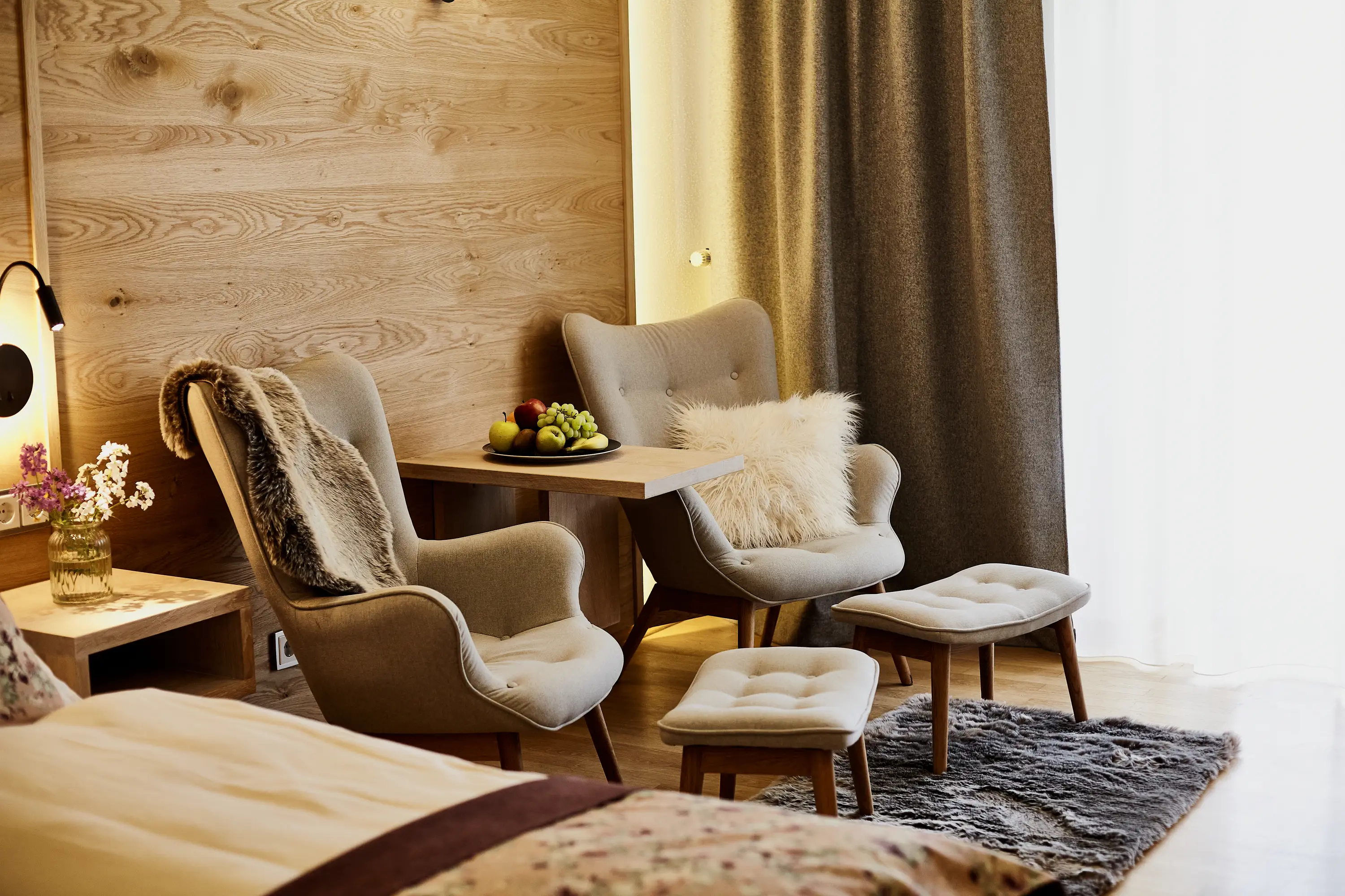 Die Zimmer im Gut Edermann sind je nach Kategorie und Ausrichtung unterschiedlich gelegen und bieten – abhängig vom Zimmertyp – Panoramablick, Bergblick oder eine ruhige Nordlage.