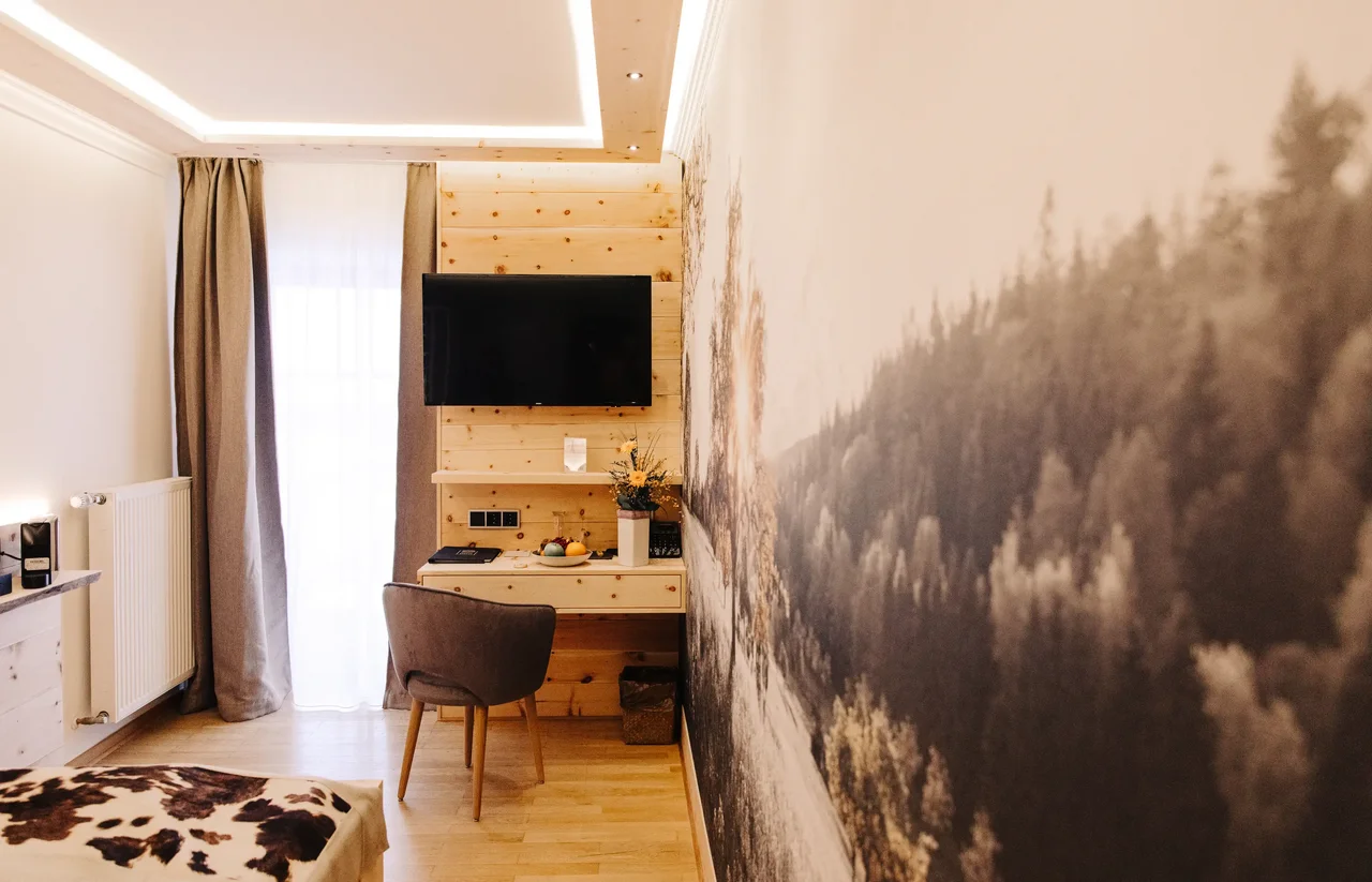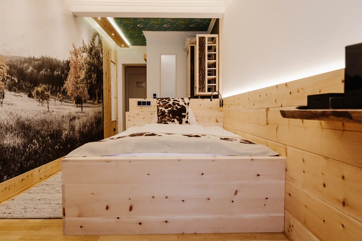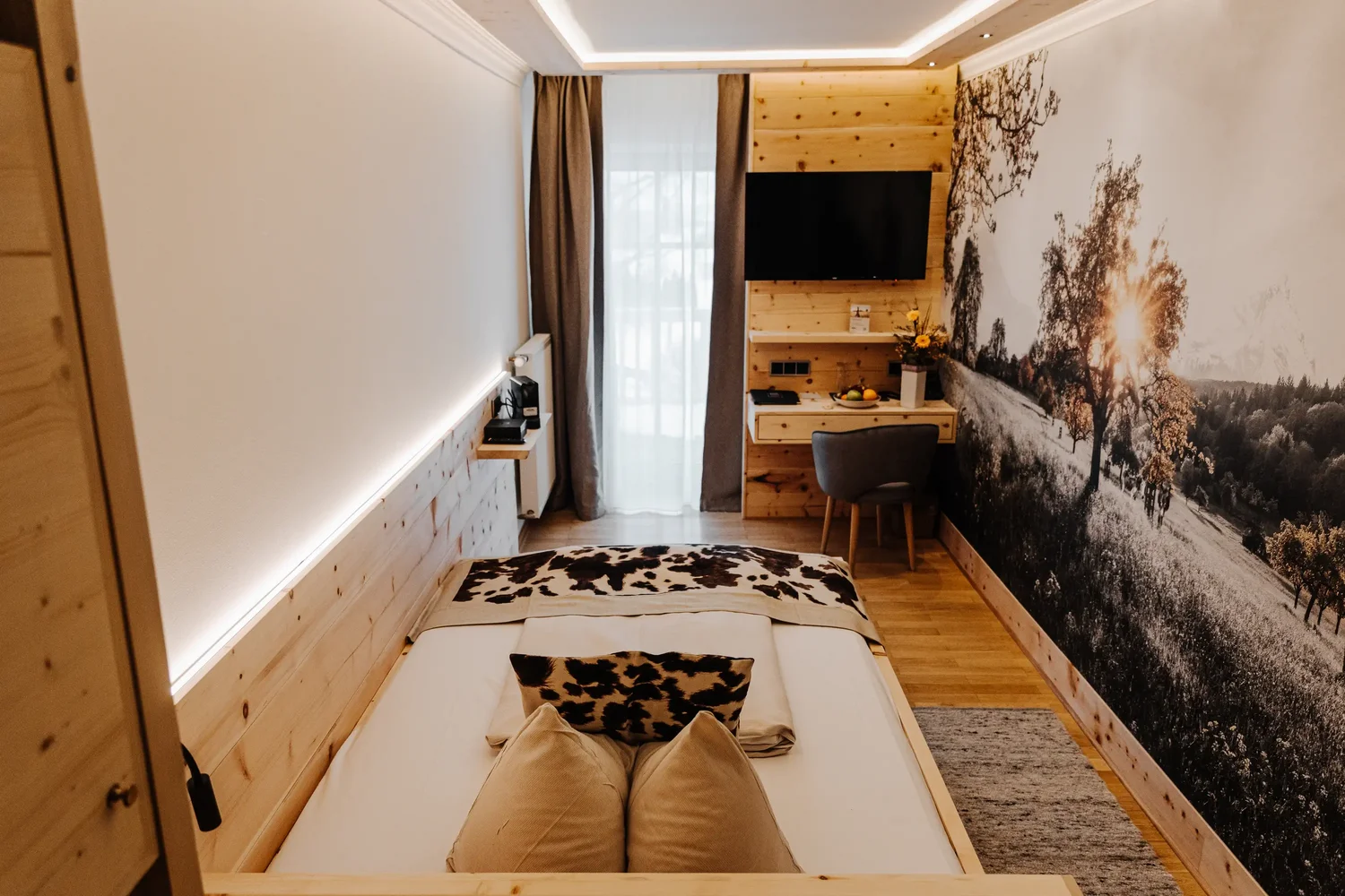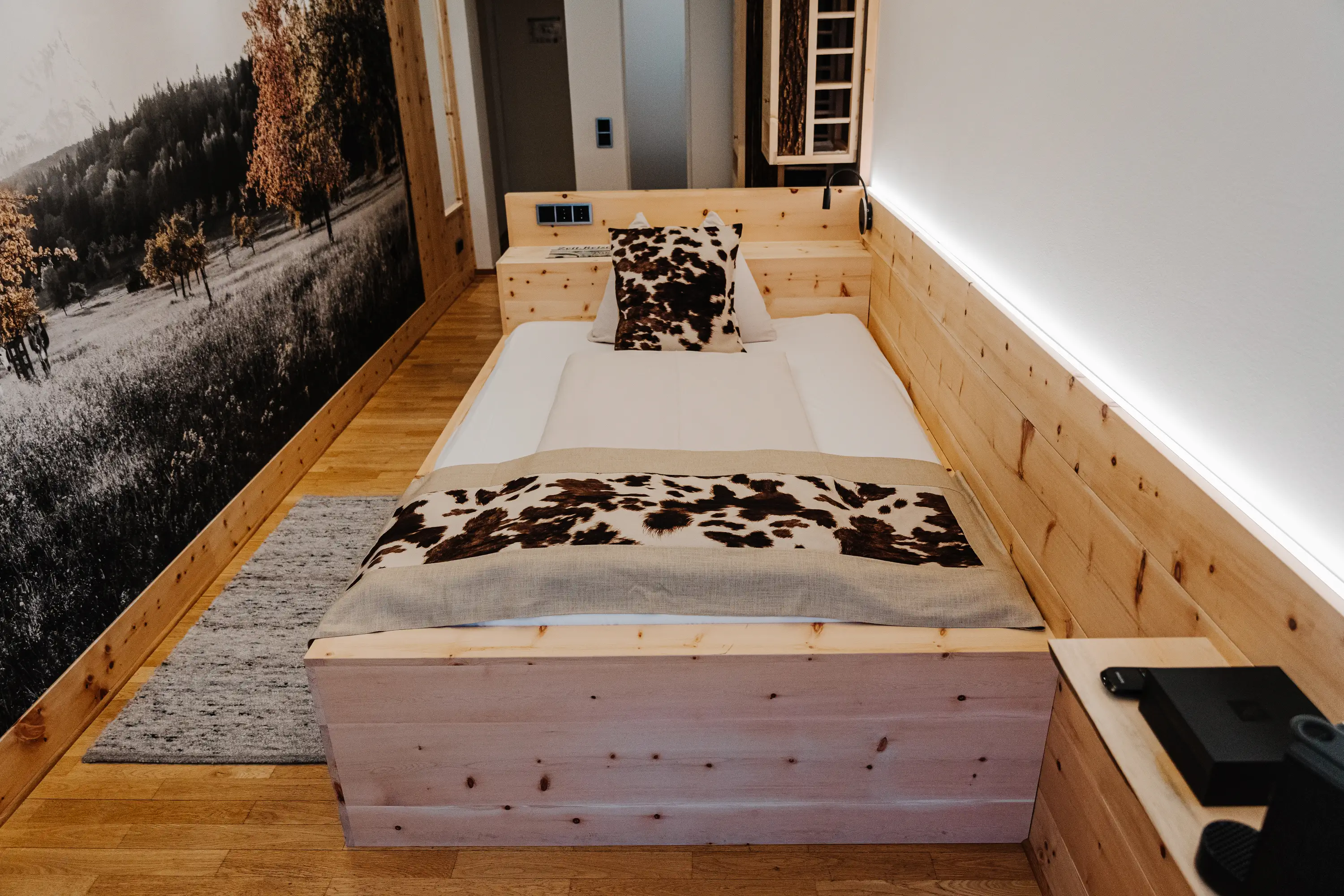 Das Einzelzimmer Almzauber verbindet natürliche Materialien mit klarer Raumstruktur. Holz, ruhige Farben und ein durchdachtes Raumgefühl schaffen Geborgenheit. Ideal für Gäste, die bewusst Zeit für sich suchen.