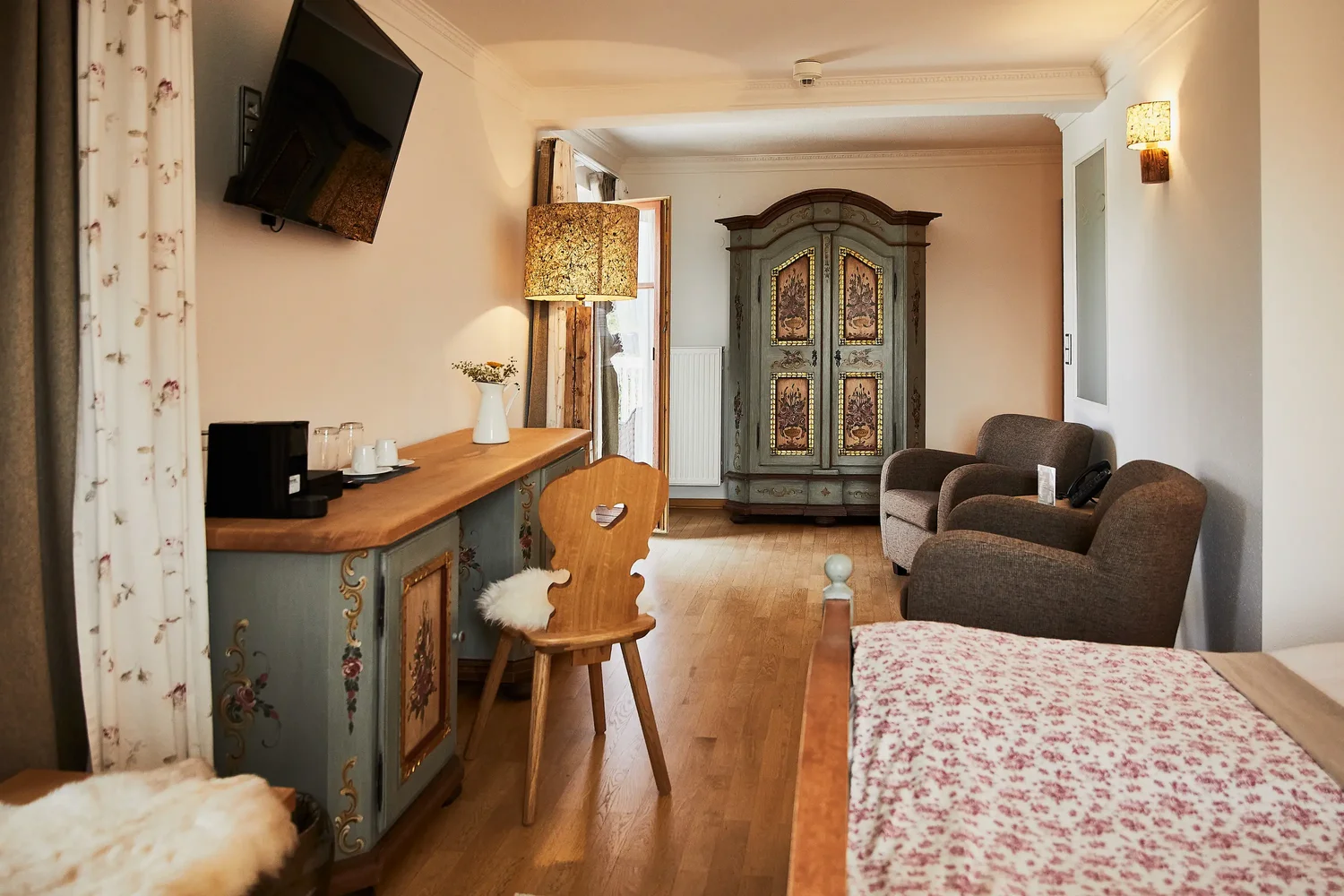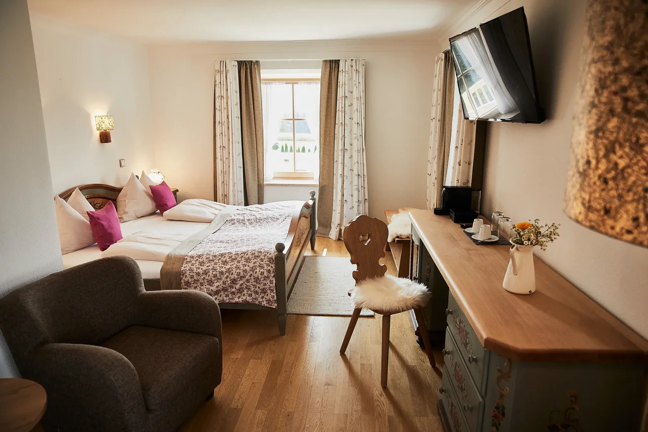 Gemütlich, hell und klassisch eingerichtet – das Doppelzimmer Landhaus verbindet traditionelle Elemente mit modernem Komfort. Warme Farben, Naturholz und liebevolle Details schaffen eine Atmosphäre zum Ankommen und Durchatmen. Mit 29 m² bietet es Raum für 1–2 Personen. Doppelbett (180 × 200 cm), Dusche, Minibar und Kaffeemaschine sorgen für entspannte Tage – drinnen wie draußen in der Bergwelt rund um Gut Edermann.