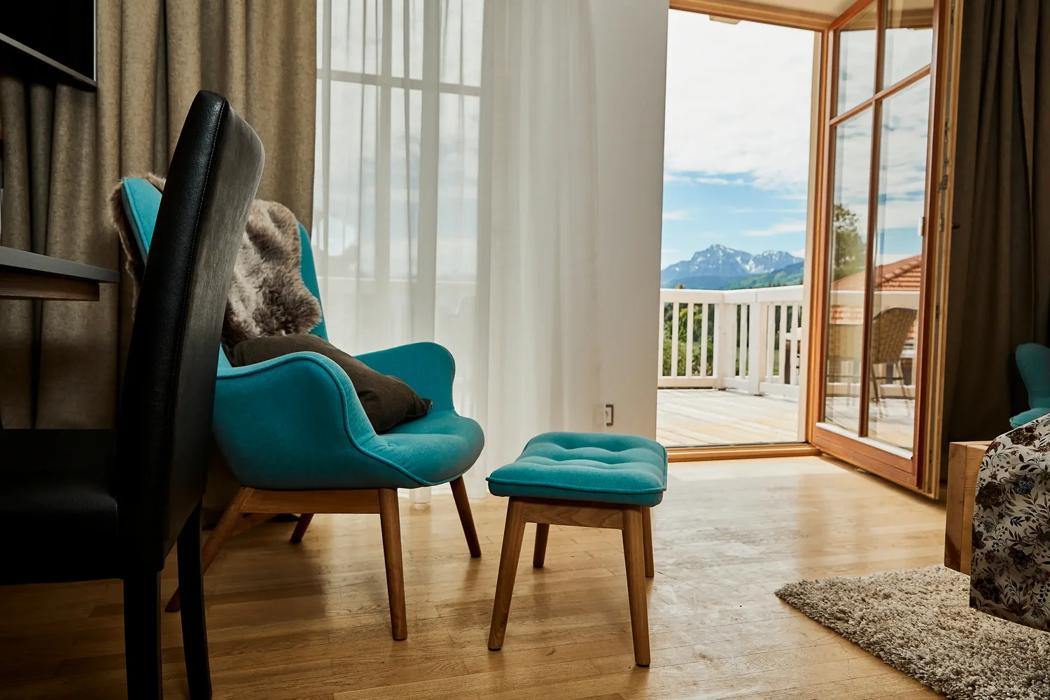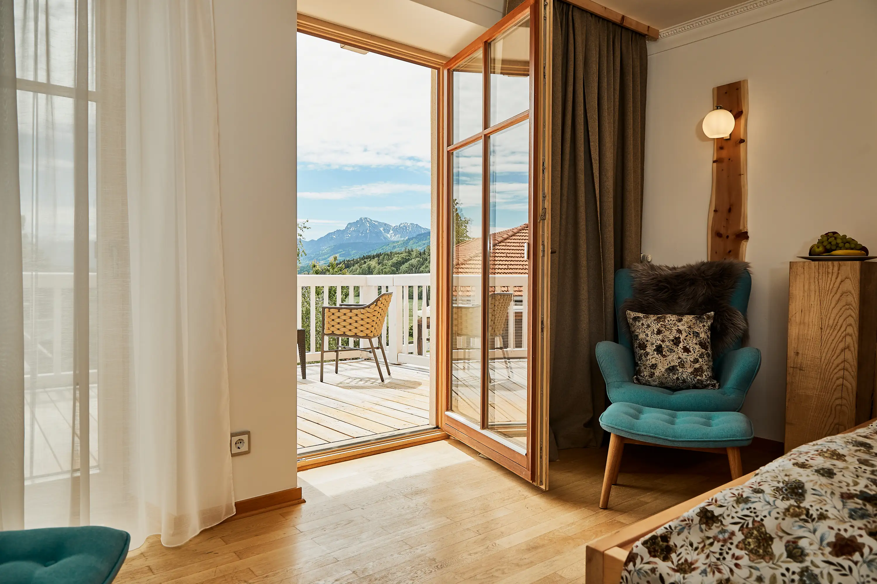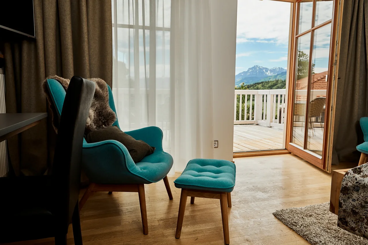 Auf 19–24 m² erwartet Sie ein lichtdurchfluteter Rückzugsort mit besonderem Highlight: dem freien Blick in die Chiemgauer Bergwelt. Vom Balkon aus öffnen sich Wiesen, Weite und Horizonte – ein Logenplatz für Sonnenaufgänge und stille Abende. Naturholz, warme Farben und klare Linien schaffen eine ruhige Atmosphäre. Das komfortable Doppelbett (180 × 200 cm) und eine optionale Aufbettcouch bieten Raum für bis zu drei Personen. Biosphären-Frühstück, optionales 4-Gang-Genussmenü und die Nutzung des 2.700 m² Alpen-Spa sind inklusive – für Tage voller Ausblick und Entspannung.