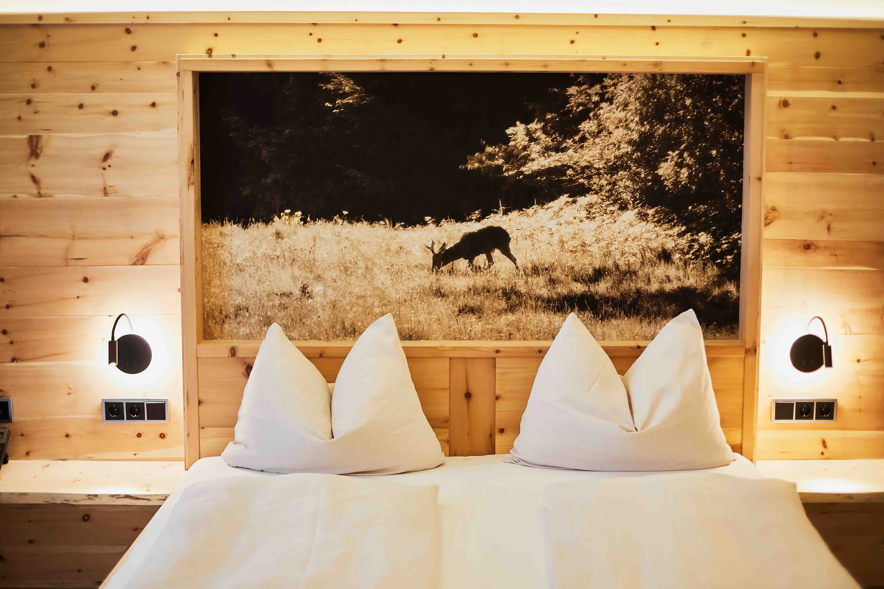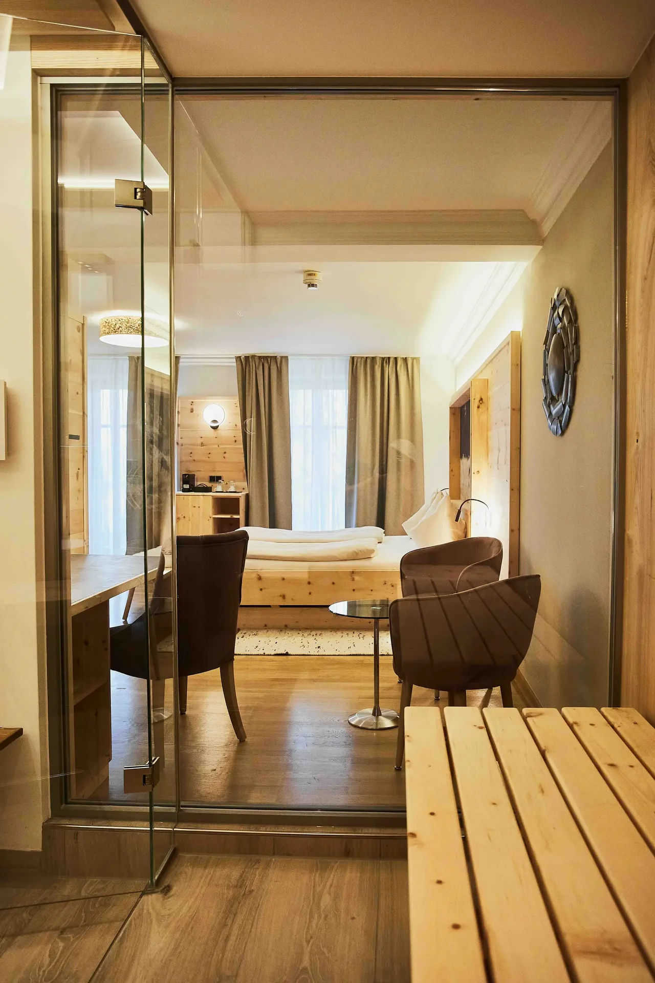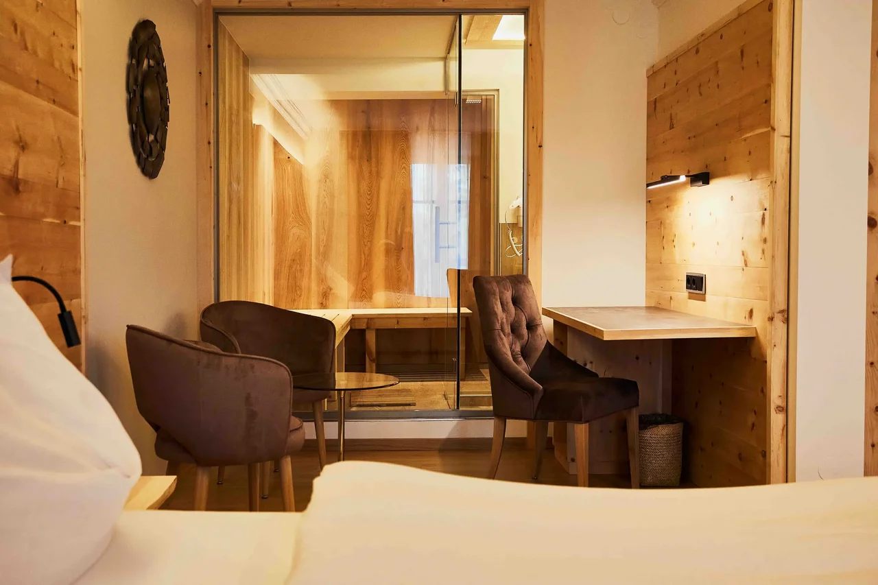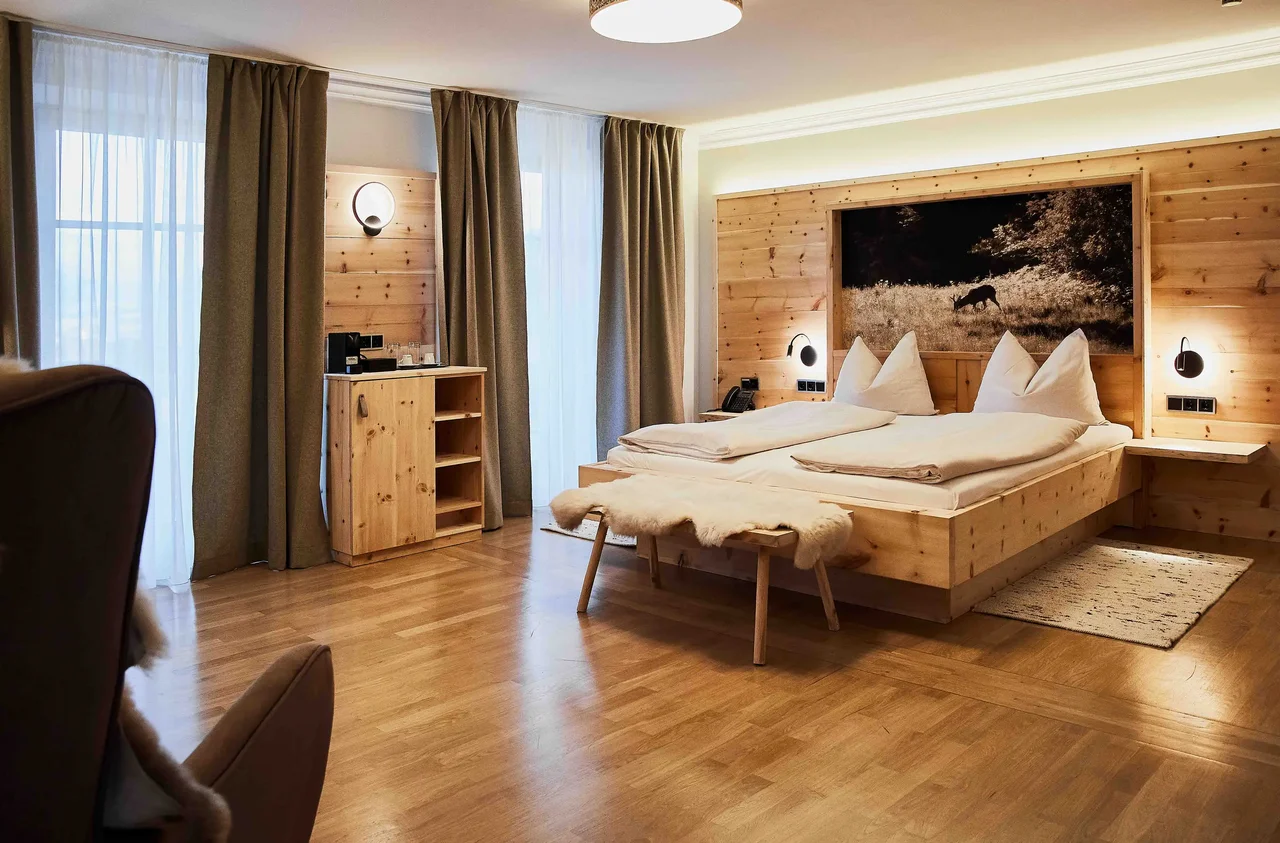 Die Junior Suite Watzmann bietet auf rund 45 m² Raum für bewusste Auszeit zu zweit. Klare Linien, viel Holz, weiche Stoffe. Der Blick geht hinaus – Richtung Berge, Richtung Weite. Ein abgetrennter Balkon erweitert den Raum nach draußen. Innen sorgt die eigene Sauna im Zimmer für einen stillen Rückzugsort. Wer hier wohnt, bleibt für sich – und ist doch eingebettet in die Landschaft.